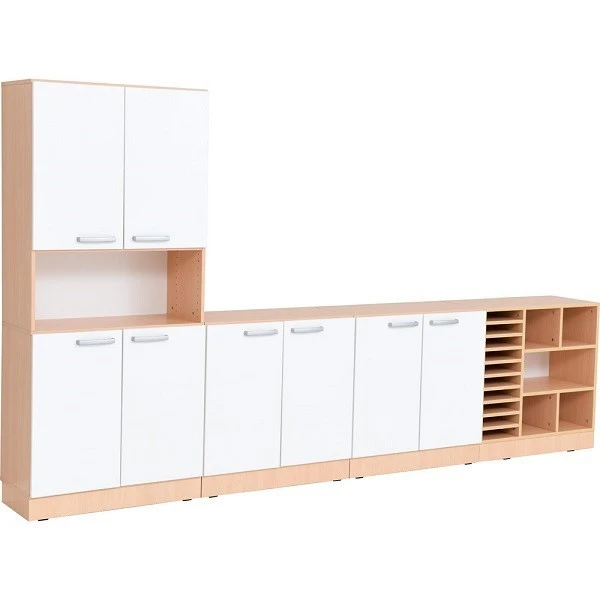 Cette proposition d’aménagement permet d’équiper une salle des professeurs ou un espace de direction et d’offrir de nombreux rangements.