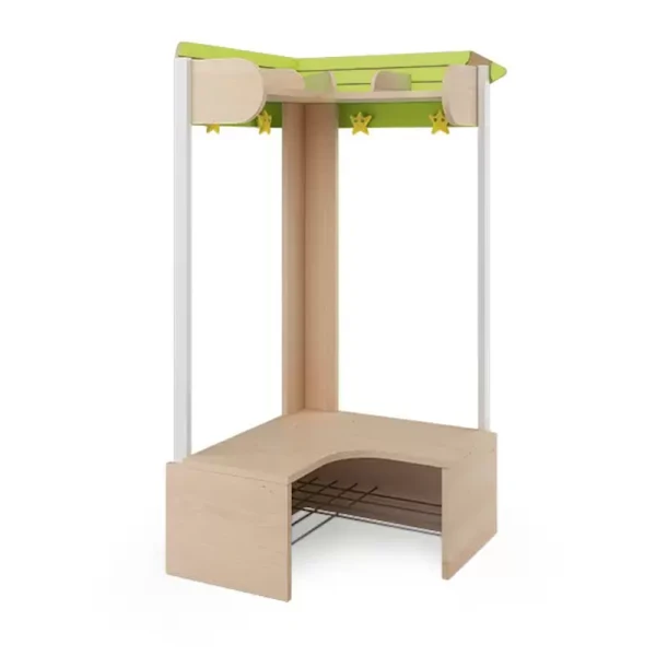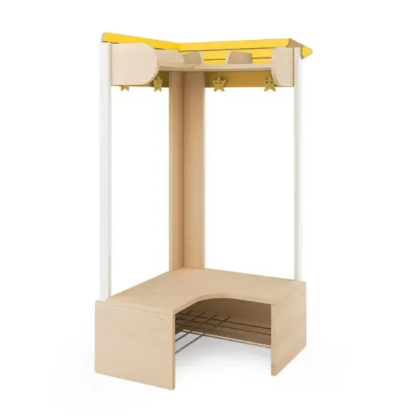 Le banc vestiaire angle pour 4 enfants a une structure en métal, un banc finition bouleau avec étagère pour les chaussures, 4 casiers et 4 patères en forme d’étoile.