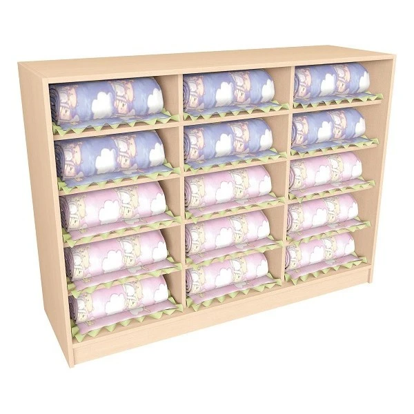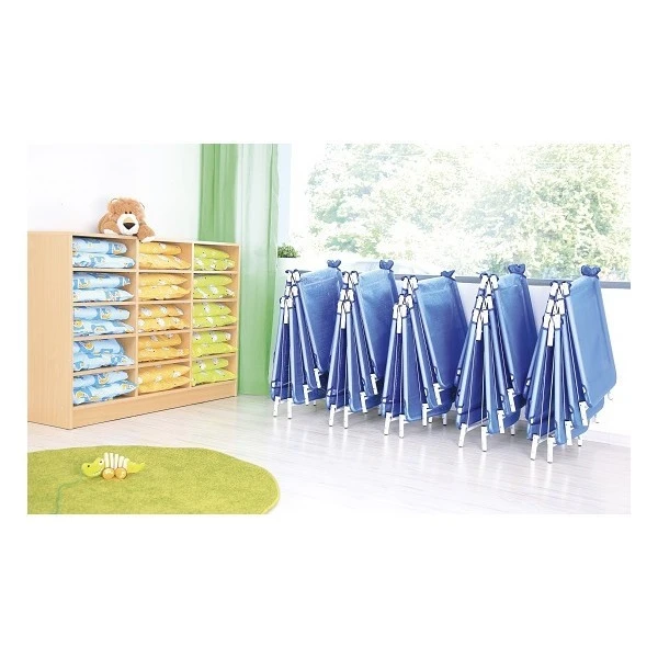 Le meuble avec casiers permet d’aménager un espace accueil ou un espace sieste dans une crèche ou une classe de petite section.