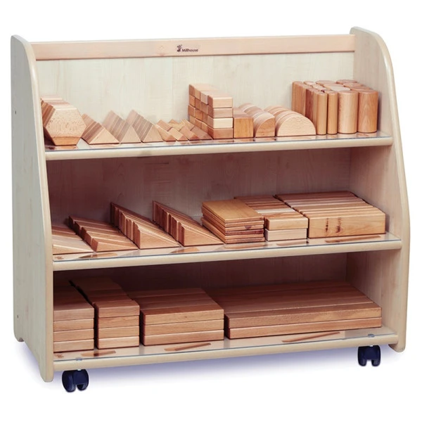 Le chariot avec jeux en bois Montessori est un meuble de la gamme Millhouse avec des jeux de construction pour développer la motricité fine, améliorer la coordination et l’exploration des différentes formes et tailles.