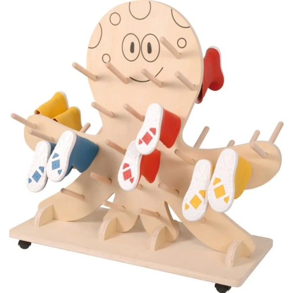 En forme de pieuvre le chariot support bottes et chaussures accompagne les enfants de façon ludique vers l’autonomie ; ils peuvent accrocher eux-même leur bottes ou leurs chaussures.