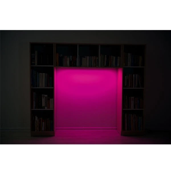 Sous l’étagère du haut, il y a une bande de LED et la luminosité peut être réglée à distance : orange, rouge, bleu, vert…