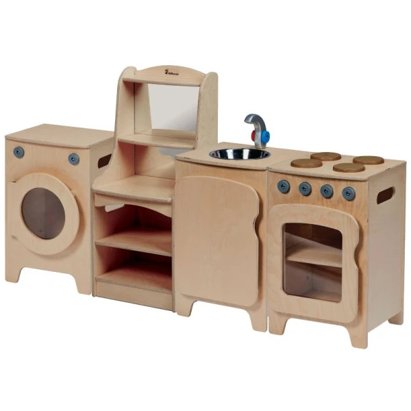 Le jeu d’imitation maternelle en bois pour enfant est composé d’une cuisinière, un évier, un lave-linge et commode de rangement.