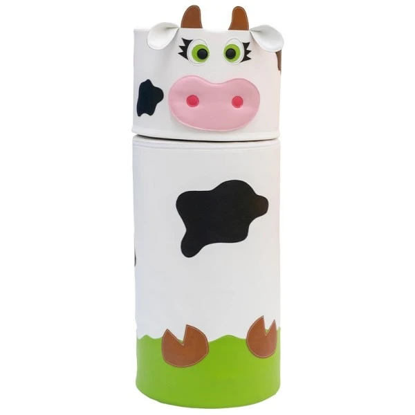 L’ensemble de 12 assises en mousse et le 1 pouf vache se range facilement grâce au sac de rangement en simili cuir et fermeture éclair.