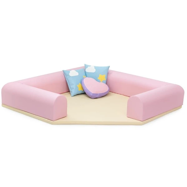 Les rebords avec une hauteur de 34 cm sécurisent l’espace et sont aussi utilisés comme module de motricité pour les petits aventuriers.