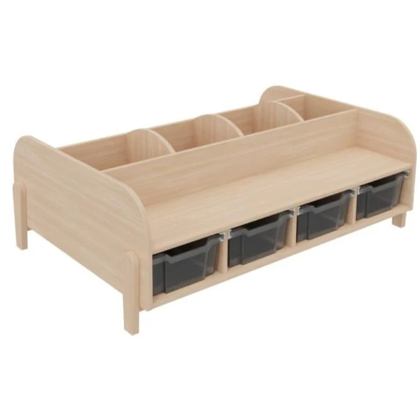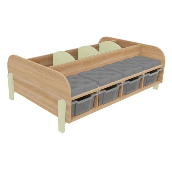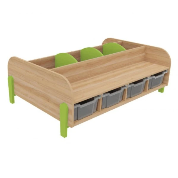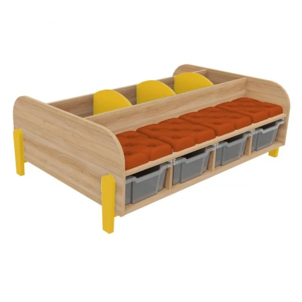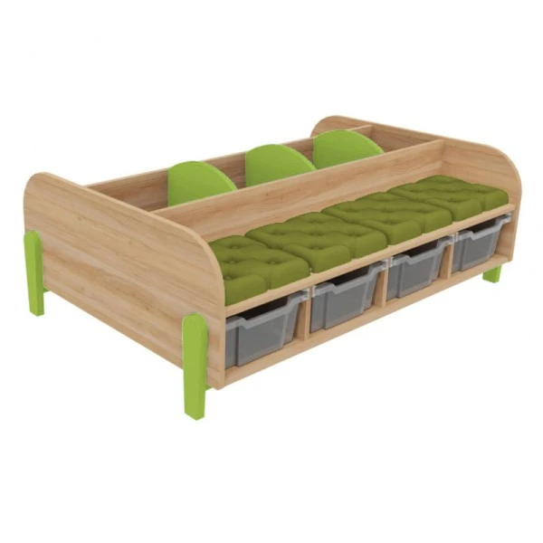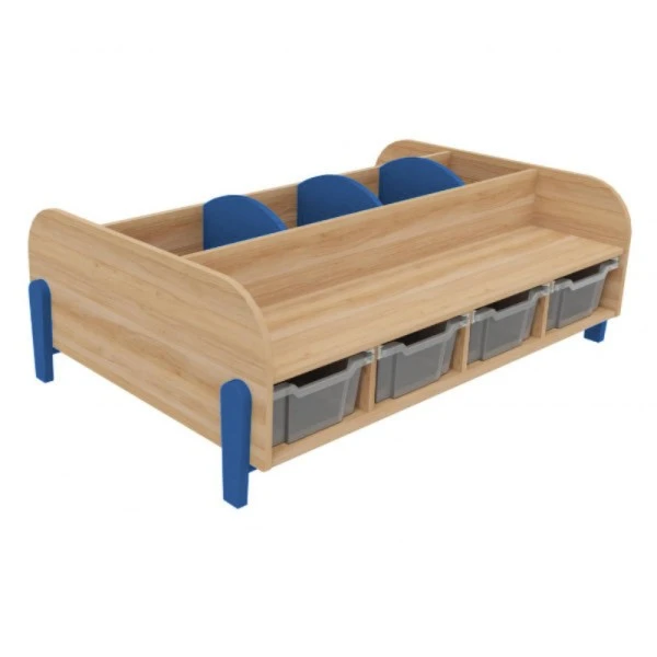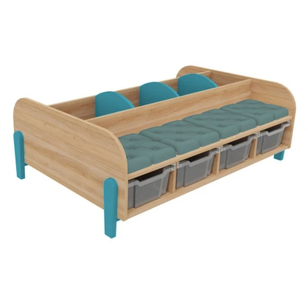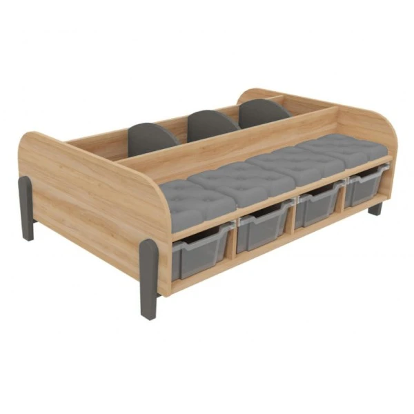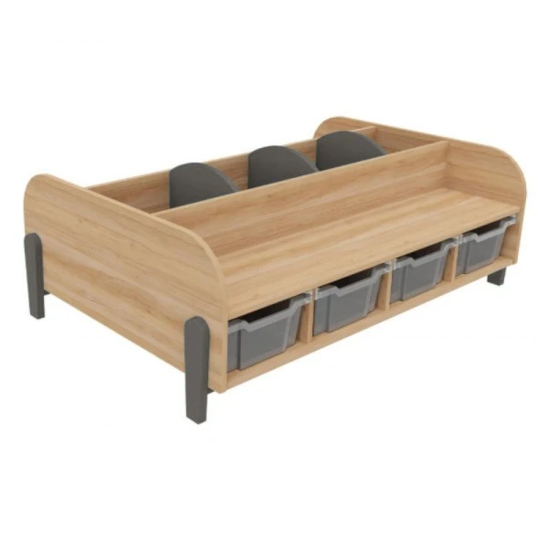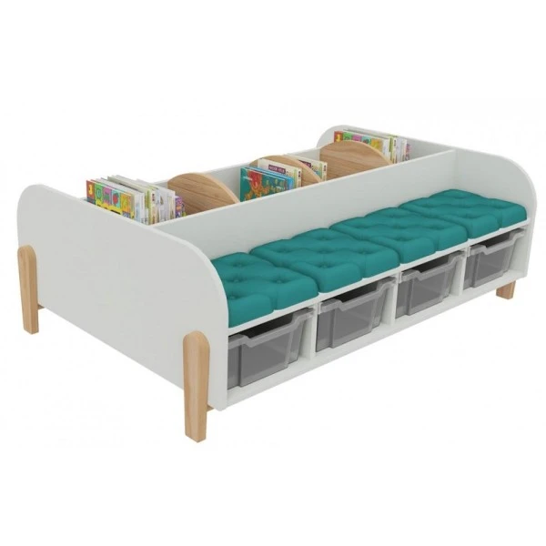 Adapté pour une utilisation dans une bibliothèque, une salle de classe et un espace périscolaire, le grand banc avec bacs à albums permet à plusieurs personnes de s’y installer et de ranger des livres dans les 3 compartiments et des jouets dans les 4 bacs de rangement en plastique sous l’assise.