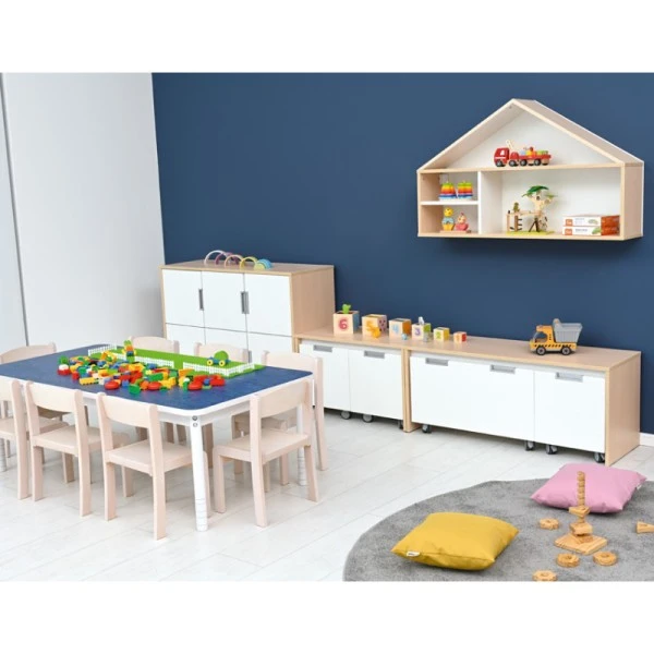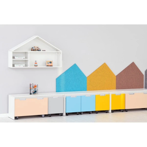 L’installation de la grande étagère murale en forme de maison peut être complétée avec les autres meubles pour collectivité de la gamme QUADRO pour un aménagement de salle de classe, d’accueil de loisirs, de mini club… esthétique, coloré et design.