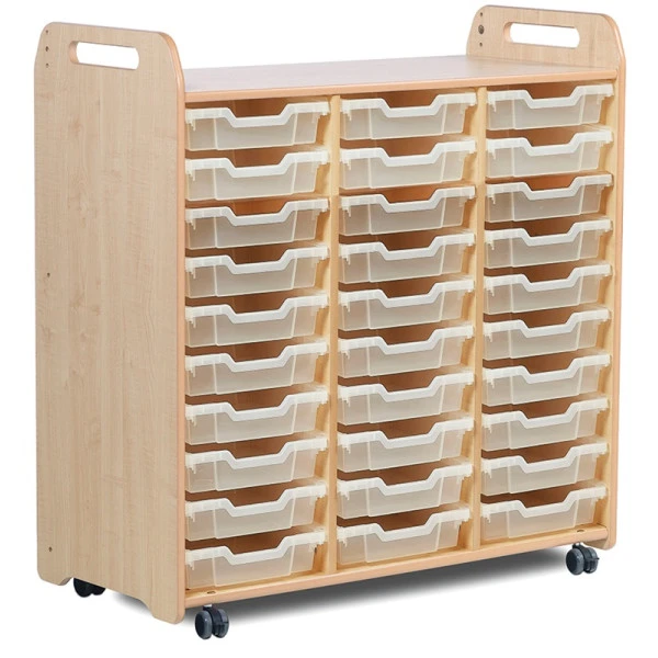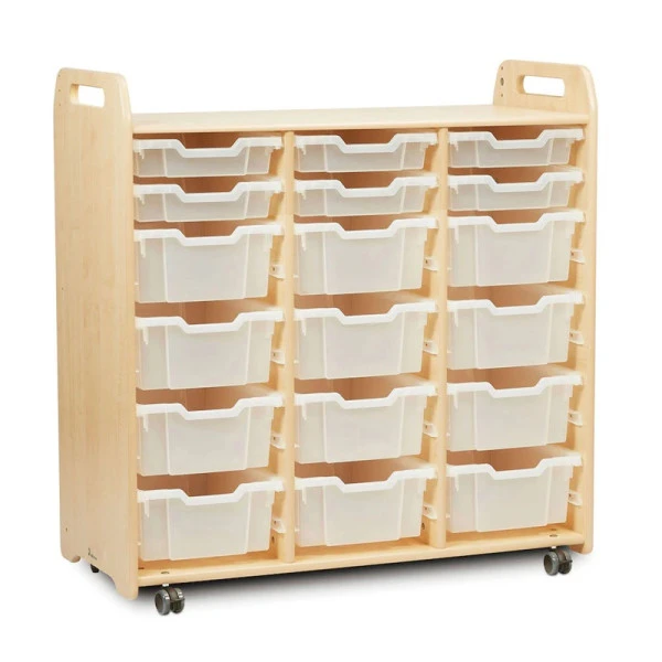 Doté de roulettes avec freins, le grand meuble avec bacs peut se déplacer facilement selon la configuration de la salle de classe ou de l’espace jeux.