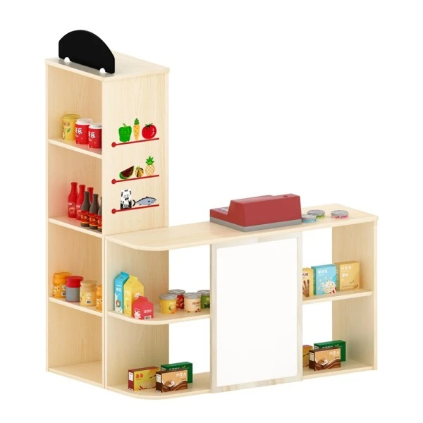 Il est composé de nombreuses tablettes qui permettent de créer une véritable mini-épicerie et d’optimiser le rangement des jouets dans l’espace coin imitation.