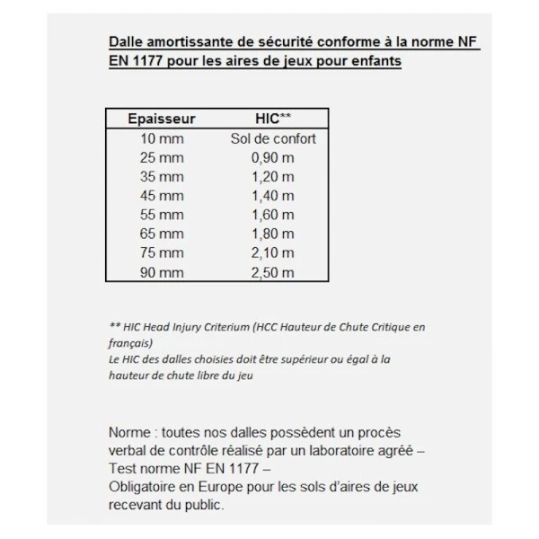 Le HIC des dalles choisies doit être supérieur ou égal à la hauteur de chute libre du jeu (indiquée sur les notices des jeux).