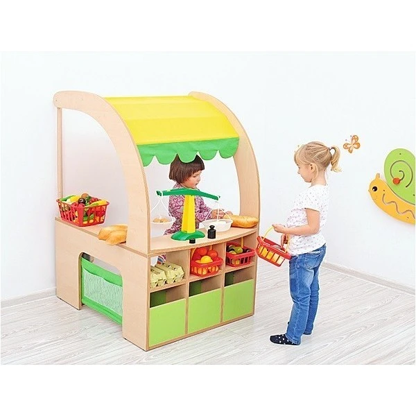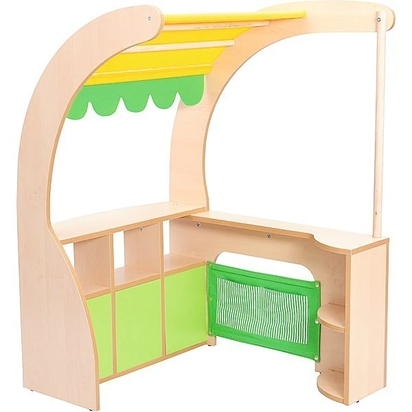 Le mobilier d’angle pour que les enfants puissent jouer à la marchande ou au marchand a été étudié pour optimiser l’espace consacré aux jeux d’imitation dans une salle de classe maternelle, une garderie…