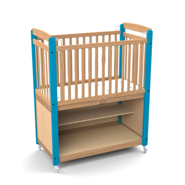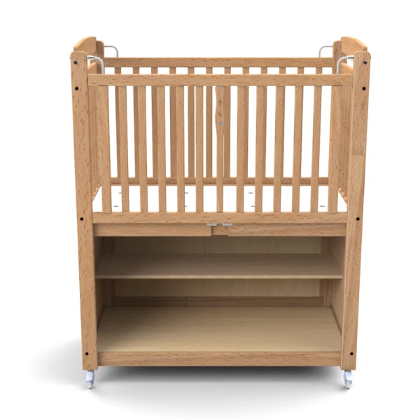 Le lit crèche avec espace de rangement a une demi étagère inférieure et permet de garder à porter de mains tous les articles et les accessoires de literie.