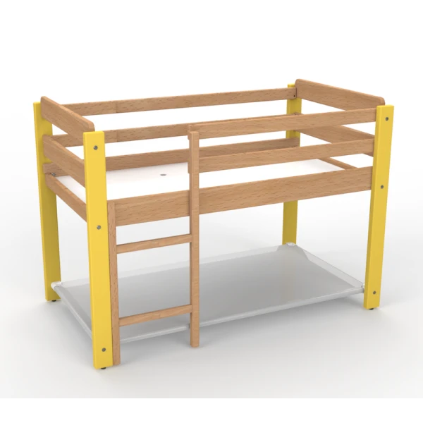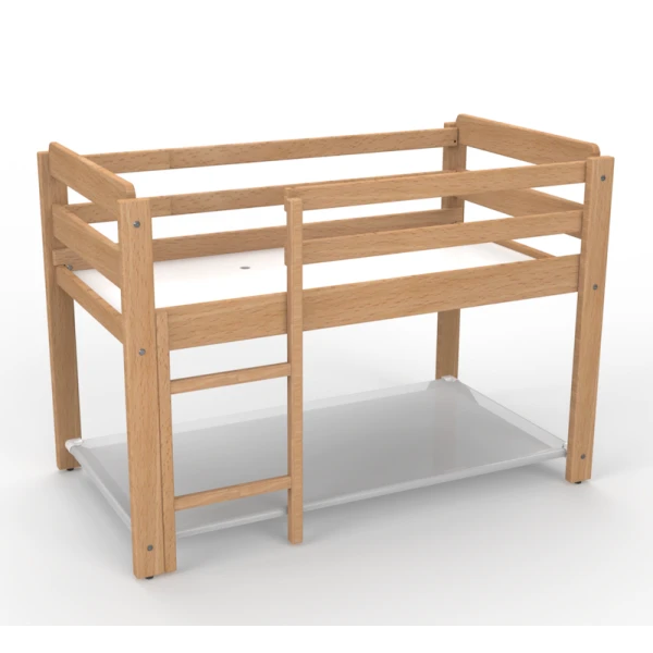 Le lit 2 couchages pour enfants en école maternelle est composé d’un lit surélevé / lit gain de place et d’une couchette avec un sommier en toile tendue, aérée et facile à entretenir.