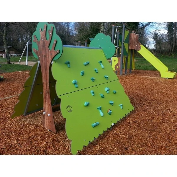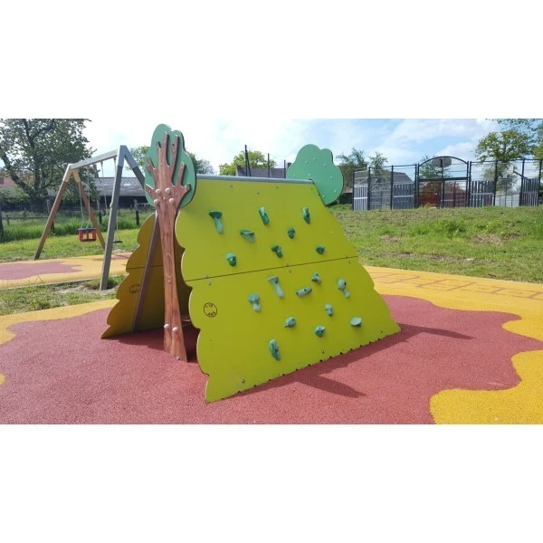 Ce jeu pour espace enfant d’extérieur permet aux plus agiles de grimper au mur d’escalade, aux plus créatifs de réaliser des jeux d’imitation et aux plus calmes de s’installer sur le banc.
