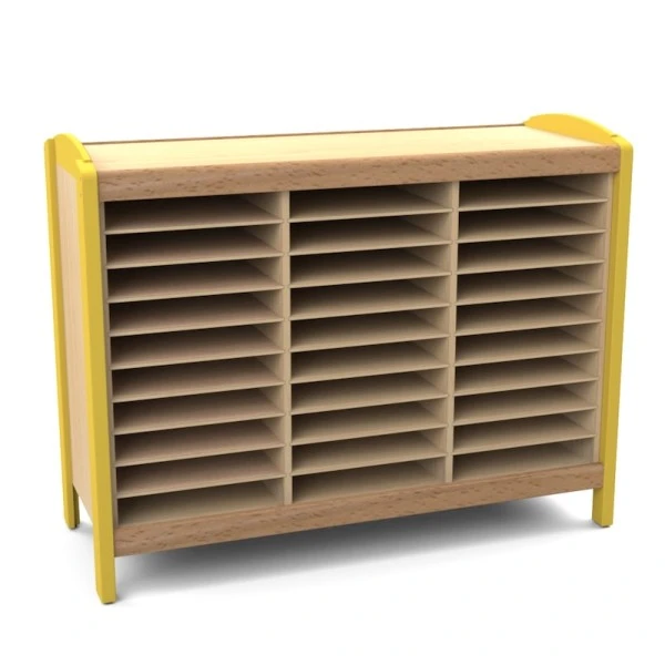 Le meuble pour rangement des dessins a 27 tablettes amovibles pour permettre à 30 enfants de déposer facilement leurs dessins sans les abimer.