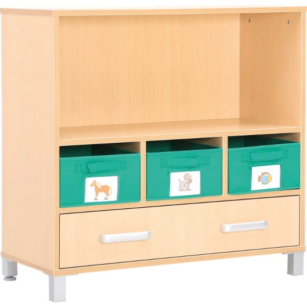 Le meuble scolaire est composé d’une étagère, d’un grand tiroir et de 3 emplacements pour bacs de rangement, livres ou jouets.