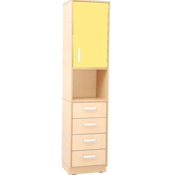 Le meuble de rangement haut est composé de 4 tiroirs, d’étagères avec porte et d’un casier de rangement.