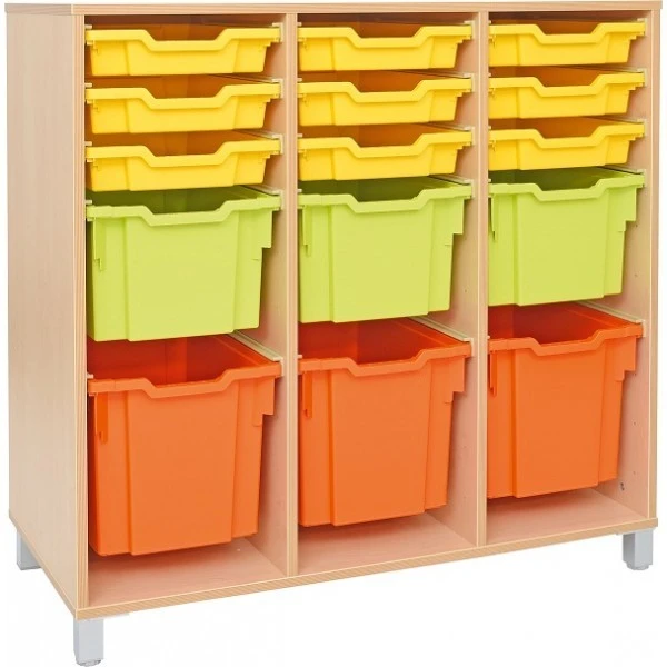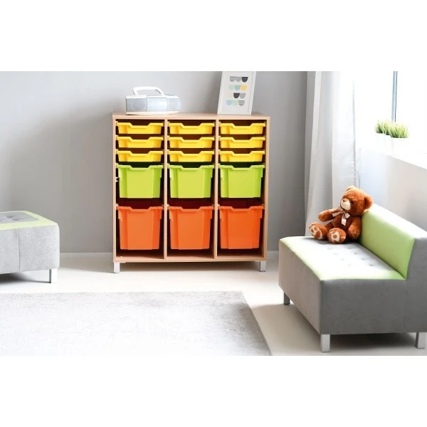 Le meuble de rangement pour crèche et école est livré avec 15 bacs en plastique (9 jaunes, 3 verts et 3 oranges) qui coulissent avec des glissières.