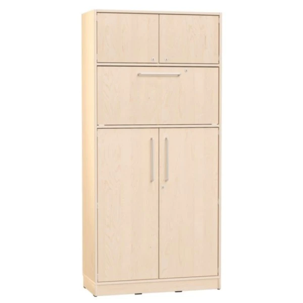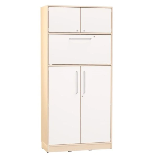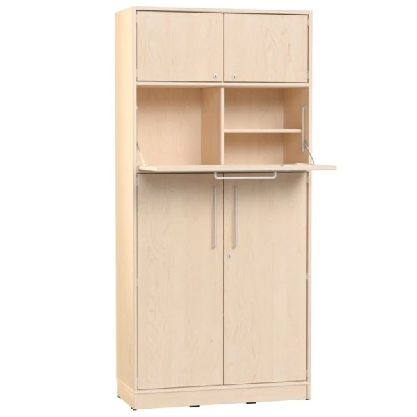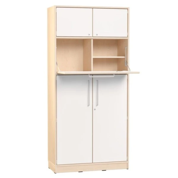 Avec ses nombreux rangements et son plan de travail intégré et rabattable avec serrure (hauteur 113 cm = adulte debout), cette armoire haute est idéale pour l’espace accueil d’une crèche, d’un mini club… ou d’une garderie.