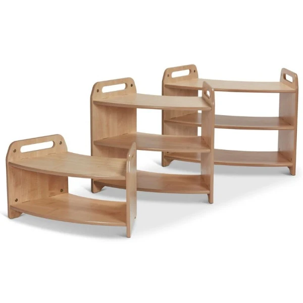Le meuble ouvert bas à 45° de la marque Millhouse a été conçu selon l’approche de la méthode Montessori ; il n’a pas de séparateur pour plus de polyvalence et les enfants ont facilement accès au matériel.
