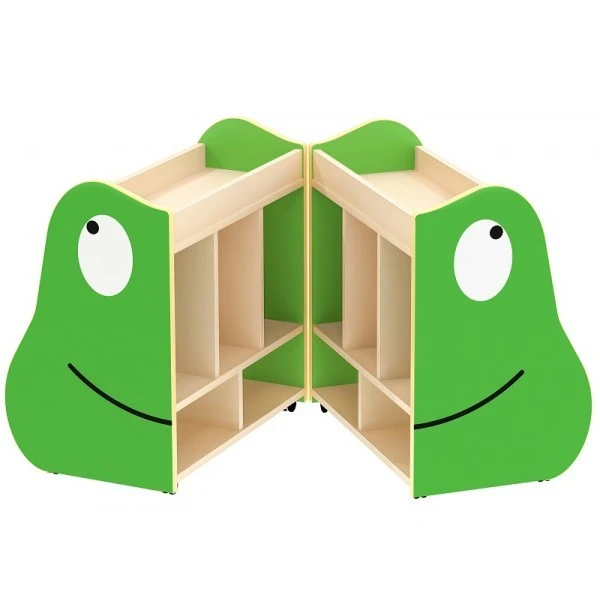 Le meuble multifonctions grenouille propose de nombreux rangements pour les jouets et les livres dans une structure petite enfance, une ludothèque, une salle de classe…