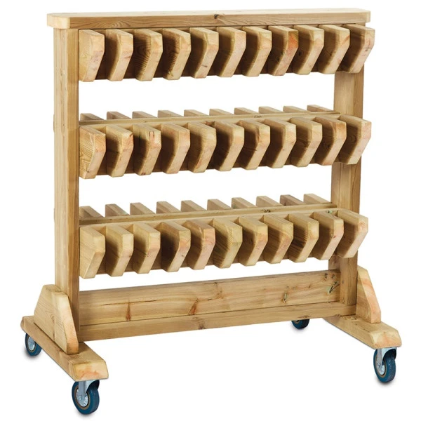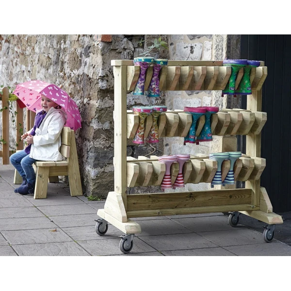 Le rangement chaussures enfants extérieur à 4 roulettes avec freins permet de stocker jusqu’à 30 paires de bottes pour évacuer l’eau et garder propre les locaux intérieurs en crèche, école maternelle, …