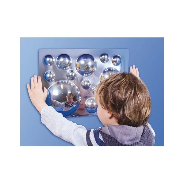 Les enfants s’amusent à se découvrir dans les courbes convexes des 4 miroirs déformants et à explorer les différentes formes avec leurs mains.