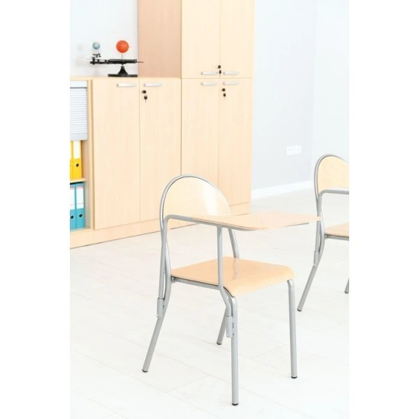La chaise avec tablette écritoire fixe (Taille T6) a une structure métallique finition peinture Epoxy (diamètre 25 mm) et une assise en multiplis hêtre vernis (épaisseur 8mm).