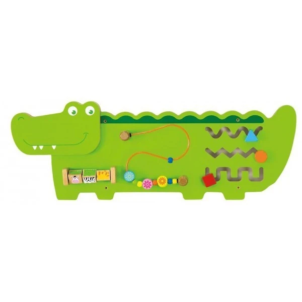 Le jeu mural en bois crocodile propose différentes activités pour développer la motricité fine, la socialisation et la créativité des enfants.