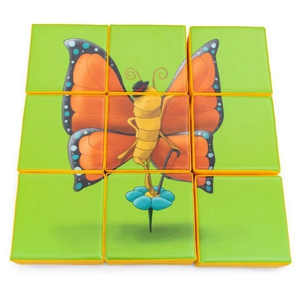 Avec le puzzle géant en mousse de 9 pièces double face, les enfants ont la possibilité de choisir leur dessin sérigraphié : papillon ou libellule.