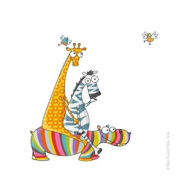 Qu’il est beau l’Hippo avec toutes ses couleurs. Le zèbre et la girafe ont grimpé sur son dos pour une longue promenade ! Le Sticker mural Balade entre amis, c’est une déco qui met de la bonne humeur dans votre coin jeux ou votre salle d’attente !