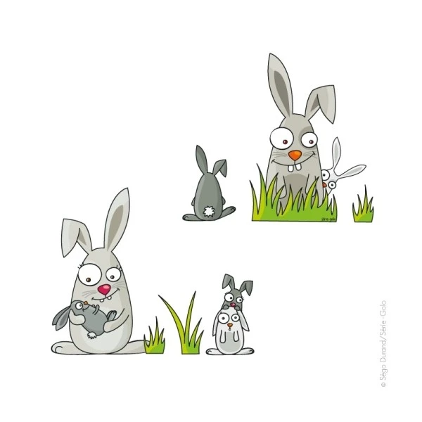 Il y a maman Lapin, papa Lapin et leurs bébés. Ils font des câlins et se cachent dans l’herbe. Les enfants les adorent ! Les lapins accompagnent les enfants dans de belles aventures !