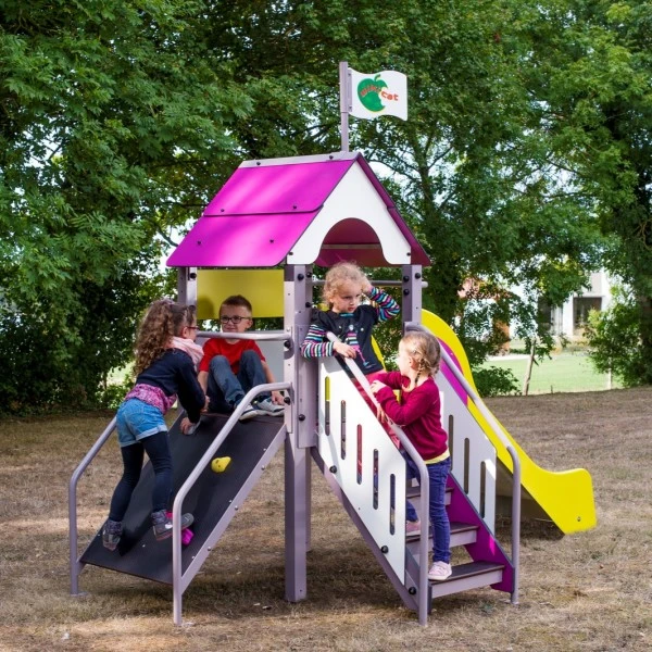 La structure de jeux Fripounette Mini Grimpe idéale pour que les enfants de 3 à 7 ans puissent jouer dans la cour extérieure d’une école maternelle ou d’un accueil de loisirs.