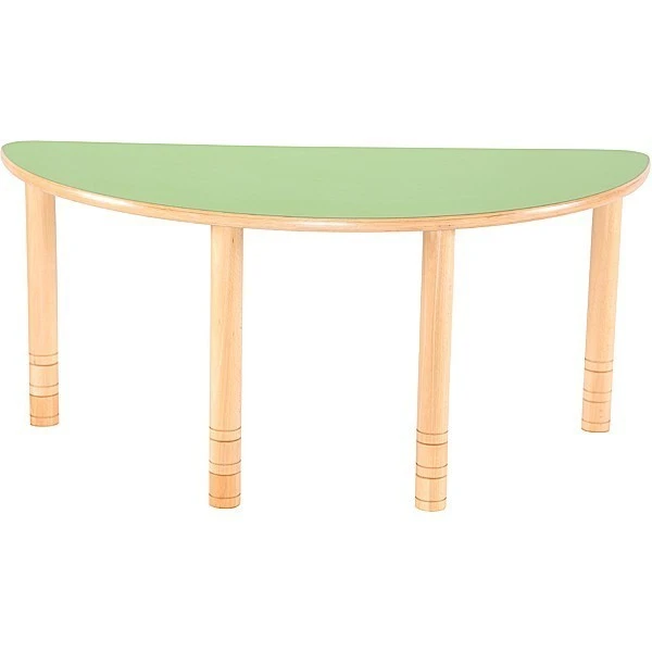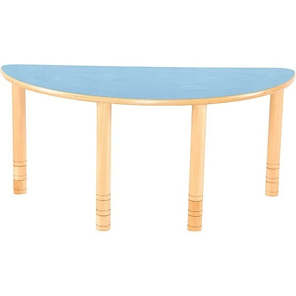 La table crèche demi cercle réglable a un plateau en contreplaqué et stratifié HPL coloré avec les coins légèrement arrondis pour la sécurité des enfants.