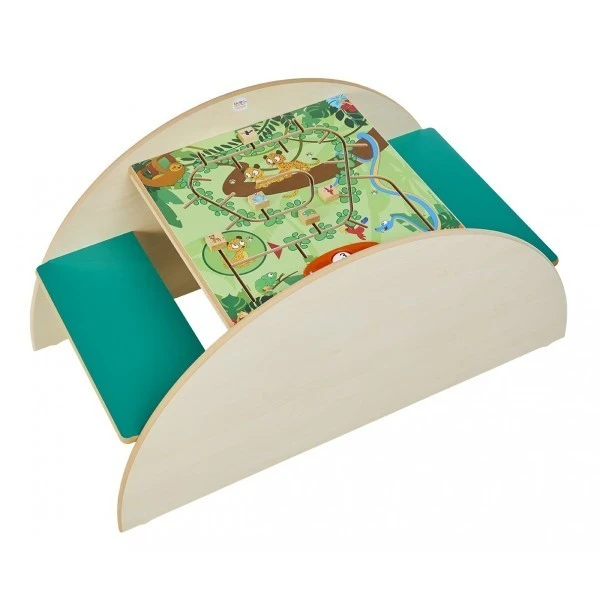 Cette table de jeu en bois a les joues bouleau et les bancs verts.