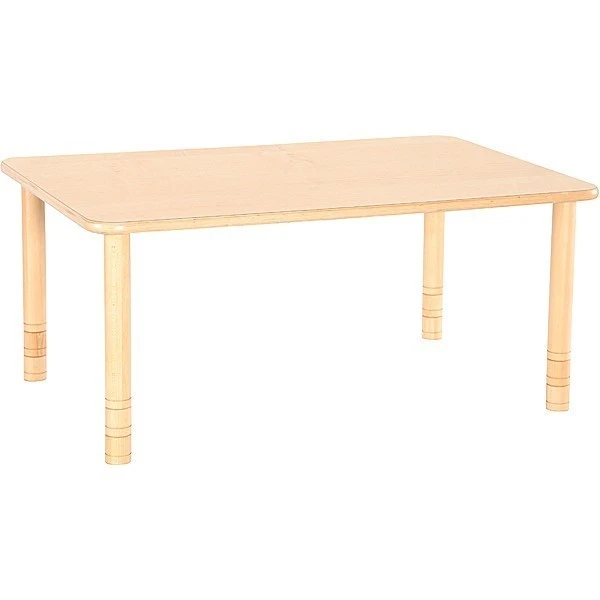 La table garderie réglable en hauteur est de forme rectangulaire avec un plateau en contreplaqué et stratifié HPL pour résister aux rayures et aux chocs.