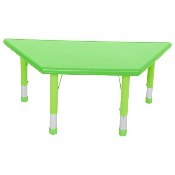La table enfant en plastique et de forme trapèze a une hauteur ajustable, est robuste et facile à nettoyer.