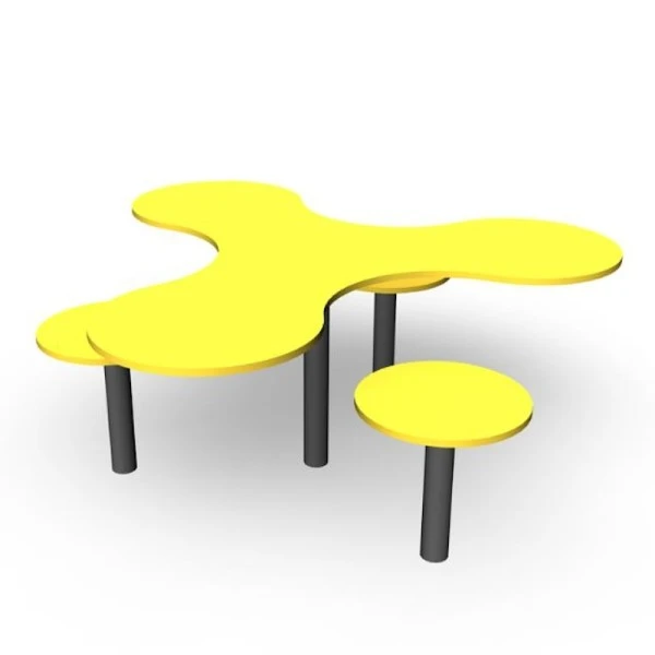 Cet ensemble comprend une table centrale de forme originale et trois assises rondes.