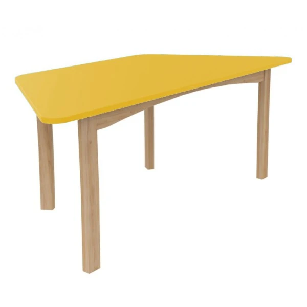 La table trapèze en bois pour enfants a un plateau de 120 x 60 cm en panneau aggloméré d’épaisseur 22 mm, stratifié et contrebalancé avec alaises bois de 23 mm ; il est facile à nettoyer et résistant aux chocs et aux rayures